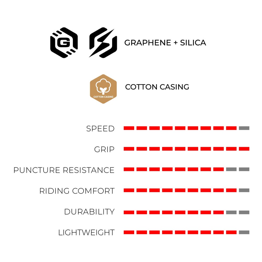 Được thiết kế với công nghệ Graphene + Silica đột phá, đã được chứng minh tại WorldTour, cùng lớp vỏ hỗn hợp cotton 320 TPI hoàn hảo vượt thời gian. Lốp được xử lý điện hóa để loại bỏ các đường nối và tăng cường khí động học. Corsa PRO Tube-Type mang đến sự kết nối mềm mại khó tin với mặt đường, loại bỏ lực cản lăn, ngăn ngừa mảnh vụn trên đường và mang lại sự tự tin khi vào cua.